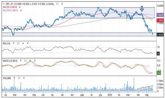 Dystrybutor odzieży był w gronie najsłabszych spółek tygodnia. W czwartek cena akcji, w reakcji na wyniki za I kw., spadła o 16,1 proc. przy obrocie sięgającym 1,72 mln zł. Na wykresie pojawiła się duża luka spadkowa i czarna świeca, a kurs znalazł się na historycznie niskim poziomie 19,7 zł. Notowania pogłębiły poprzedni dołek trendu spadkowego, dając tym samym klasyczny sygnał jego kontynuacji. Oscylator RSI wszedł już do strefy wyprzedania, ale do cyklicznie niskich poziomów jeszcze trochę mu brakuje. W tym kontekście istnieje ryzyko do pogłębienia ostatniego dna.