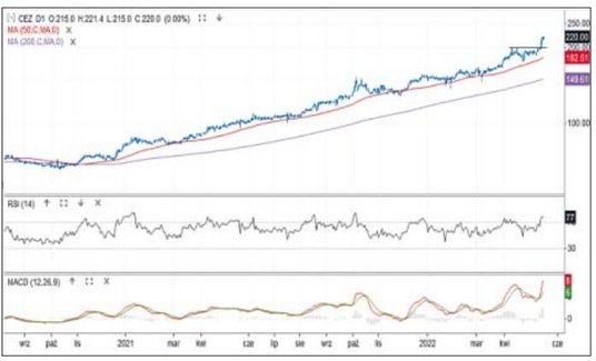 Czeska spółka nie grzeszy płynnością obrotu, ale trzeba przyznać, że stabilność wzrostowego trendu jest imponująca. Cena rośnie regularnie od pandemicznego dołka z marca 2020 r. Hossa zaczęła się z poziomu 50 zł, a w piątek cena ustanowiła rekord historyczny 221,4 zł. Oscylatory RSI i MACD sygnalizują już wykupienie, co zwiększa ryzyko korekty. Wsparciem, które skutecznie powstrzymywało ostatnie schłodzenia, jest średnia z 50 sesji. Obecnie przebiega ona przy 181 zł. Niżej barierę stanowi 200-sesyjna średnia (149 zł). Dopóki cena jest powyżej tych wsparć, dopóty obowiązuje hossa.