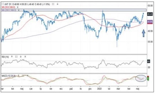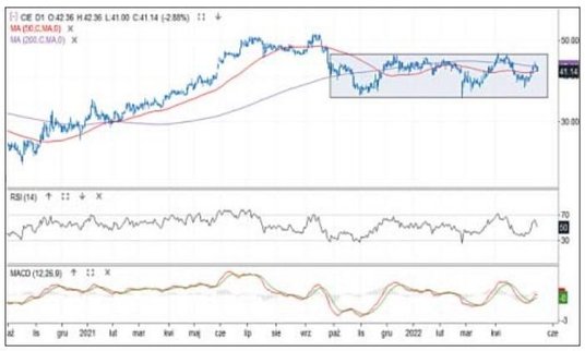 Od września 2021 r. kurs akcji chemicznej spółki porusza się w konsolidacji 35–46 zł. Od początku maja trwa fala wzrostowa w ramach tego układu. Cena zaatakowała już średnie z 50 i 200 sesji, a MACD zawrócił w górę pod linią 0. Czwartkowe wyniki za I kw., choć gorsze w ujęciu rok do roku (efekt zdarzenia jednorazowego), zostały umiarkowanie przyjęte przez rynek. Zakładając kontynuację wzrostowej fali, można oczekiwać próby ataku na opór 46 zł w perspektywie krótkoterminowej. Wybicie w górę dałoby sygnał z potencjałem wzrostu do 57 zł. Najbliższe wsparcie to strefa 40–37 zł.