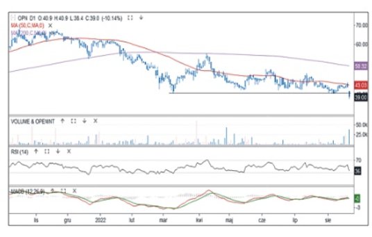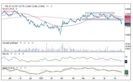 Od maja kurs akcji energetycznej spółki zmagał się z oporem 3,5 zł i wsparciem 3 zł. Pierwszego pokonać się nie udało, a drugie pękło w minionym tygodniu. Powód? Publikacja szacunkowych wyników za II kwartał i zawiązanie blisko miliardowej rezerwy na produkcję energii. Na wykresie widać szereg czarnych świec, które pokonały nie tylko wspomniane wsparcie, ale także średnią z 200 sesji, czyli umowną granicę hossy/bessy. Cena znalazła się najniżej od marca, a na horyzoncie widać lutowy dołek, czyli 2 zł. Oscylatory RSI i MACD sygnalizują wyprzedanie, co daje szansę na korektę. Oporem jest 3 zł.