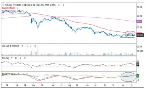 Sektor bankowy miał słaby tydzień, głównie za sprawą rozczarowującego odczytu PKB Polski za II kwartał. Spowolnienie powoli staje się faktem, a perspektywa dalszych podwyżek stóp staje się coraz mniej realna. W tym kontekście nie dziwi fakt, że w reakcji na odczyt akcje PKO BP potaniały o 5,05 proc., a kurs niemal w punkt odbił się od ruchomego oporu w postaci 50-sesyjnej średniej. Oscylator MACD zawraca w dół na linii 0, co sugeruje cykliczny zwrot i powrót do głównego, spadkowego trendu. Najbliższe wsparcie to jego dołek, czyli 23,38 zł.