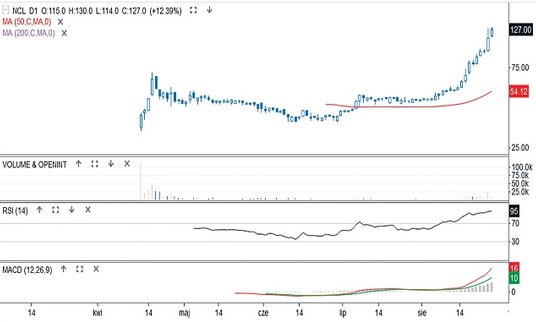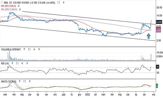 Biotechnologiczna spółka była najgorętszym tematem tygodnia na rodzimym parkiecie. Po informacji o rejestracji preparatu Onko BCG w Niemczech i Szwajcarii kurs wystrzelił w górę o 38 proc., przy ponad 50 mln zł obrotów. RSI od razu znalazł się w strefie wykupienia, a piątek przyniósł realizację zysków po teście 10 zł. Warto jednak zerknąć na wykres z szerszej perspektywy, bowiem widać tu: wybicie z szerokiego kanału spadkowego, złoty krzyż na średnich z 50 i 200 sesji oraz zawracający w górę nad linią 0 MACD. Poziom 10 zł pozostaje najbliższym oporem, a wsparciem jest strefa 7,5–7 zł.