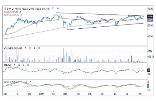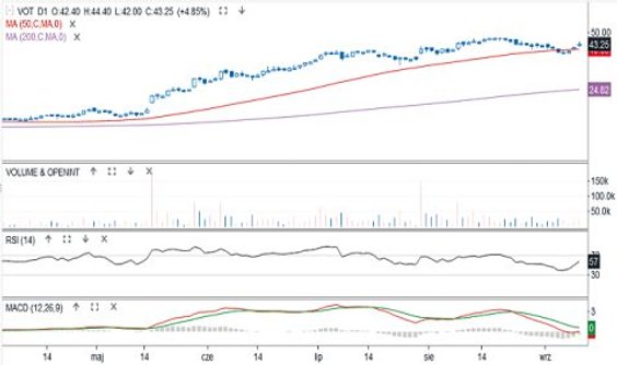 Tytułowy bank to jedyny przedstawiciel branży, który nie poddał się bessie. Roczna stopa zwrotu z jego akcji przekracza 40 proc., a na wykresie w ujęciu długoterminowym wciąż jest układ wzrostowy. W perspektywie średnioterminowej cena porusza się w coraz węższej konsolidacji, ale fale spadkowe są szybko korygowane i kurs regularnie wraca nad średnie z 50 i 200 sesji. Co więcej, pod koniec sierpnia bank pokazał lepsze od oczekiwań wyniki. Relatywna siła, wzrostowy układ i mocny raport za I półrocze przemawiają na korzyść wybicia w górę. Najbliższe opory to 61 i 63,5 zł, a wsparcia – 57, 56 i 53 zł.