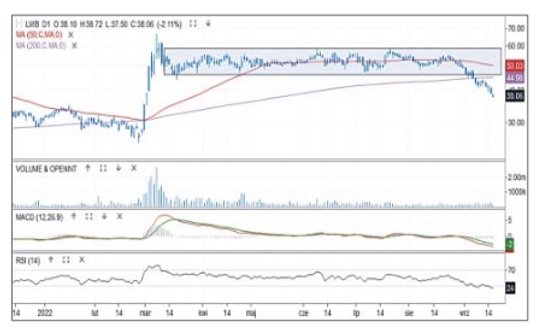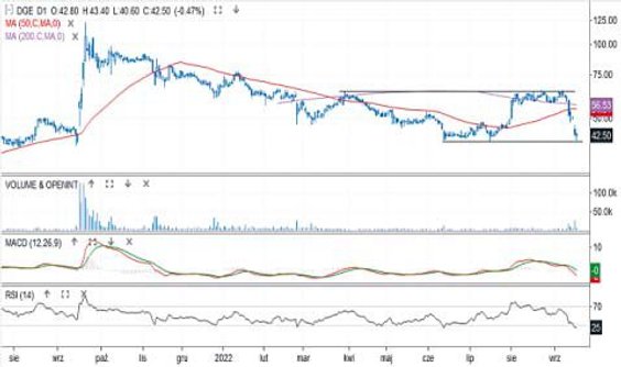 Od marca do końca sierpnia kurs akcji węglowej spółki poruszał się w konsolidacji 46–58 zł. Wrzesień przyniósł wyjście dołem. Kurs przebił dolną granicę wahań i przebiegającą nieco niżej średnią z 200 sesji. W minionym tygodniu cena spadała w porywach do 37,5 zł, a szerokość konsolidacji daje potencjalny cel zniżki 34 zł. Choć opublikowane w środę wyniki za I półrocze były dobre, rynkowi nie spodobały się informacje o obniżeniu planu wydobycia. Średnia z 50 sesji zbliża się do 200 sesji, co zwiększa ryzyko powstania formacji krzyża śmierci. To może z kolei zwiastować, że 34 zł nie będzie ostatecznym celem niedźwiedzi.