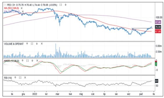 W sektorze bankowym trwa wzrostowa korekta. Wśród najbardziej płynnych przedstawicieli branży najsilniejsze jest Pekao. Od początku października akcje podrożały o blisko 25 proc. Cena akcji przebiła w górę średnią z 50 sesji i zaatakowała strefę oporową 75–77 zł. To tu kumulują się poziomy ostatnich lokalnych szczytów. Przebicie się przez te bariery zwiększy szansę na ruch do 200-sesyjnej średniej (obecnie 88 zł), a w konsekwencji na długoterminowe przesilenie. Byki wspierają rosnące w strefach neutralnych oscylatory MACD i RSI. Średnia z 50 sesji jest najbliższym wsparciem.