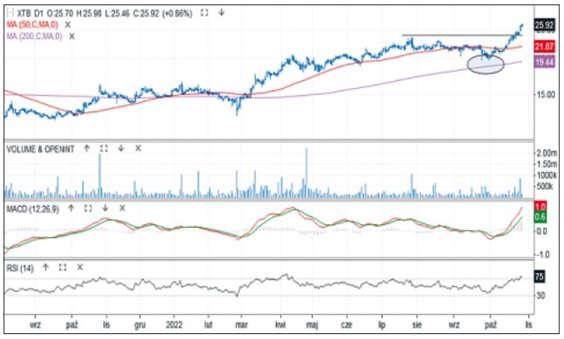 Tytułowy producent gier korzysta na ostatnim ożywieniu w branży. Od początku października akcje podrożały o ponad 10 proc. Kurs przebił średnią z 50 sesji i linię trendu spadkowego poprowadzoną po czterech ostatnich szczytach. Co istotne, trwające odbicie zaczęło się na wsparciu 38,8 zł, wyznaczonym przez minima z jesieni 2021 r. Można więc mówić o próbie utworzenia długoterminowego, podwójnego dna, co może zapowiadać trwalsze umocnienie. Na ten moment celem jest średnia z 200 sesji (51 zł). Rosnące w strefach neutralnych MACD i RSI dają szansę na rychłe dojście w te rejony.