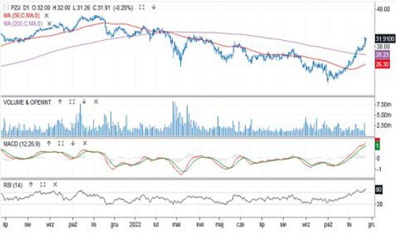 Ubezpieczeniowy gigant zaskoczył w minionym tygodniu pozytywnie raportem za III kwartał. W reakcji cena pokonała opór przy 30 zł, wyznaczony przez ostatni lokalny szczyt w układzie bessy. Mamy więc na wykresie potwierdzenie wcześniejszych długoterminowych sygnałów przesilenia: pokonanie średnich z 50 i 200 sesji. Obie średnie są coraz bliżej utworzenia formacji złotego krzyża, choć zanim do tego dojdzie, rynkowi „przydałoby się” schłodzenie (patrz wysokie poziomy RSI i MACD). Najbliższe wsparcia są w strefie 28–30 zł, a opory 33–35 zł.