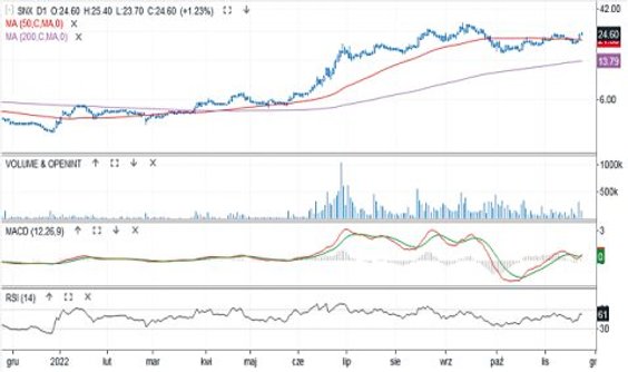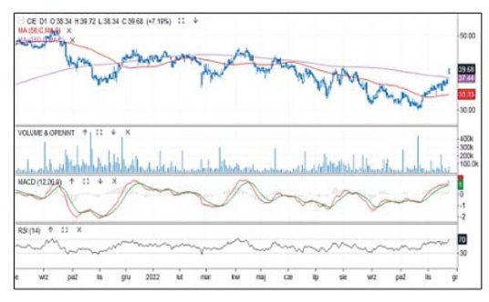W piątek, w reakcji na podniesienie prognoz przychodów za 2022 r., kurs akcji chemicznej spółki otworzył się wzrostową luką. Cena przebiła tym sposobem średnią z 200 sesji, uchodzącą za umowną granicę hossy. Z punktu widzenia analizy technicznej mamy więc wstępne, długoterminowe przesilenie. Jego potwierdzeniem będzie wyjście nad poziom 40 zł, czyli opór wyznaczony przez ostatni lokalny szczyt w układzie bessy. Wykupienie sygnalizowane przez oscylatory RSI i MACD może prowokować korektę. Najbliższe wyznacza wspomniana średnia i jej szybsza wersja (z 50 sesji) położona przy 33,3 zł.