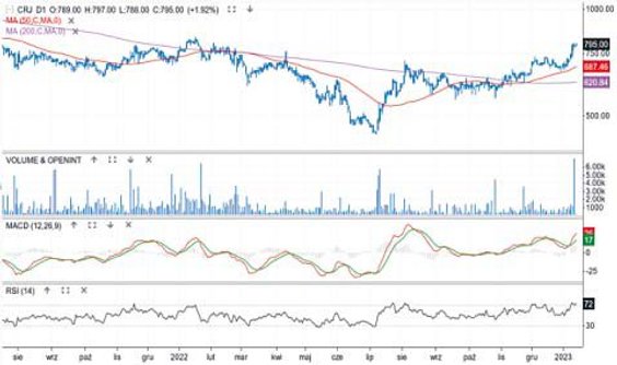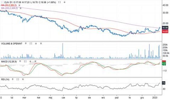 Biotechnologiczne spółki zachowują się ostatnio coraz lepiej. W minionym tygodniu sprzyjały im pozytywne rekomendacje wydane przez Noble Securities. Jednym z beneficjentów była Celon Pharma. Kurs odbił się od średniej z 50 sesji i zaatakował ważny opór w okolicy 16,7 zł. To w tym miejscu na wykresie nakładają się na siebie dwie bariery – lokalny opór z grudnia 2022 r. i linia 200-sesyjnej średniej kroczącej. W ujęciu długoterminowym widać na wykresie zaokrąglone dno, któremu po prawej stronie towarzyszą rosnące słupki wolumenu. Pułap 18,8 zł jest najbliższym zasięgiem, a wspomniana szybsza średnia pozostaje wsparciem.
