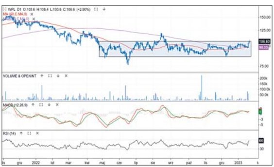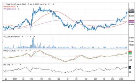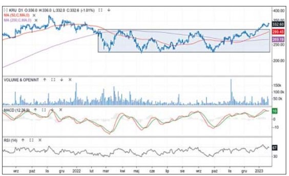 Pod koniec 2022 r. kurs akcji producenta wyrobów hutniczych utworzył na wykresie zaokrąglone dno, czyli formację spodka. W styczniu cena wybiła się górą, dając sygnał kupna. W minionym tygodniu kurs długą białą świecą przebił 5 zł, a średnie kroczące z 50 i 200 sesji utworzyły formację złotego krzyża. Analiza techniczna sugeruje więc długoterminowe przesilenie na korzyść popytu. W tym kontekście można w średnim terminie oczekiwać ruchu do długoterminowych szczytów przy 6,45 zł. Najbliższą strefę wsparcia tworzą 5 zł, a także górna granica spodka, czyli 4,6 zł.