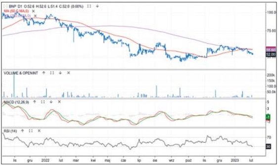 Indeks WIG-banki już dawno wyłamał się z trendu spadkowego, ale nie wszystkie podmioty wchodzące w jego skład radzą sobie tak dobrze. Kurs akcji BNP zatrzymał się na linii średniej z 200 sesji w grudniu i powoli osuwa się wzdłuż niej. Nie udało się więc przebić umownej granicy hossy ani przerwać sekwencji coraz niższych szczytów w trendzie spadkowym. Pod koniec stycznia cena zaczęła spadać, przekraczając w dół średnie z 50 i 200 sesji. Obie są teraz na niemal jednym poziomie, co sugeruje równoważenie sił. Jeśli presja podaży będzie silniejsza, cena może zejść do dołka bessy.