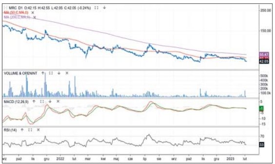 Medialne, niepotwierdzone doniesienia o konsultacjach w sprawie podatku od nadmiarowych zysków spółek naftowych i węglowych pogrążyły w minionym tygodniu tytułową spółkę. I choć Ministerstwo Środowiska i Klimatu zdementowało te informacje, walory do końca tygodnia pozostały pod presją podaży. Na wykresie widać szereg czarnych świec, które sprowadziły cenę do linii średniej z 50 sesji. Na razie wygląda to na dynamiczną korektę w budowanym od października układzie wzrostowym, ale jeśli średnia pęknie, zniżki mogą nabrać większej skali.