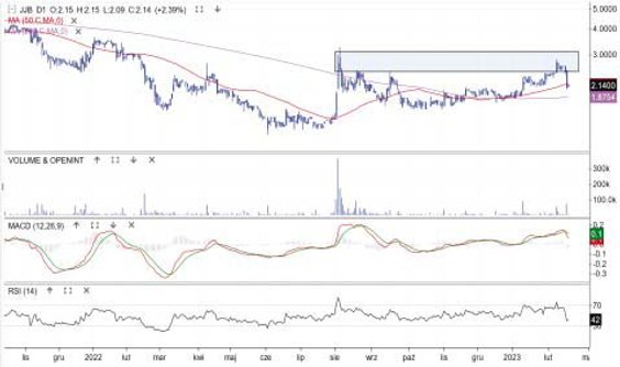 W drugiej połowie 2022 r. cena akcji producenta gier z NewConnect tworzyła formację spodka. Styczniowa fala wzrostowa wyniosła notowania do górnej strefy oporowej 2,5–3 zł, ale w minionym tygodniu cena wyraźnie zawróciła na południe. W czwartek przy podwyższonych obrotach cena spadła o 16,4 proc. Na wykresie pojawiła się duża czarna świeca, która przebiła średnią z 50 sesji. Jeśli spadek pogłębi się poniżej 200-sesyjnej średniej (obecnie 1,87 zł), wspomniana formacja zostanie zanegowana. Z kolei wyjście nad 3 zł może aktywować długoterminowe sygnały przesilenia.