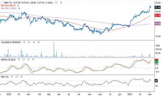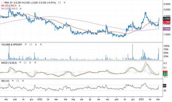 Deweloper wyróżniał się w ostatnim tygodniu pozytywnie. Po schłodzeniu do średniej kroczącej z 200 sesji cena wyraźnie odbiła, a odbiciu towarzyszyły wysokie słupki wolumenu. Warto zauważyć, że takie skokowe wahania pojawiają się od października, przez co cena próbuje stworzyć szeroki kanał wzrostowy. MACD i RSI zakręciły w górę, więc zakładając kontynuację cykliczności wahań, można oczekiwać ruchu na nowe lokalne maksima. W tym kontekście cena powinna przebić 2,81 zł. Silne wsparcia znajdują się natomiast w strefie między 50-sesyjną średnią (2,1 zł) i pułapem 2 zł.