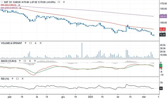 Informatyczna spółka porusza się w trendzie spadkowym od października 2021 r. Przewaga podaży jest tu bardzo wyraźna. Spółka w ogóle bowiem nie skorzystała z trwającej od kilku miesięcy ogólnej poprawy nastrojów na GPW. Ta relatywna słabość widoczna jest także w zasięgach wzrostowych korekt. Są one skutecznie zatrzymywane przez średnią z 50 sesji, a następujące później fale spadkowe wyznaczają nowe dno. Taki cykl powtórzył się w ostatnich tygodniach i w piątek cena wyznaczyła nowe dno bessy 67,02 zł. Potencjalny zasięg spadku to strefa 55–50 zł. Wspomniana średnia pozostaje oporem.