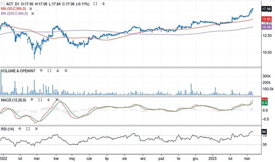 Kurs akcji dystrybutora sprzętu IT porusza się w trendzie wzrostowym, ale trafił na listę niedźwiedzi z uwagi na wykupienie. Wskaźnik RSI dla tej spółki sięgał w minionym tygodniu 90 pkt, co jest najwyższą wartością od dwóch lat i jedną z najwyższych obecnie na rynku. Co więcej, cena akcji testowała długoterminowy szczyt 17,65 zł, więc mamy co najmniej dwa techniczne argumenty za schłodzeniem notowań. Silniejszej korekty i cofnięcia do średniej z 50 sesji nie było od grudnia. W tym kontekście naturalne wydaje się, że ryzyko takiego spadku wyraźnie rośnie.