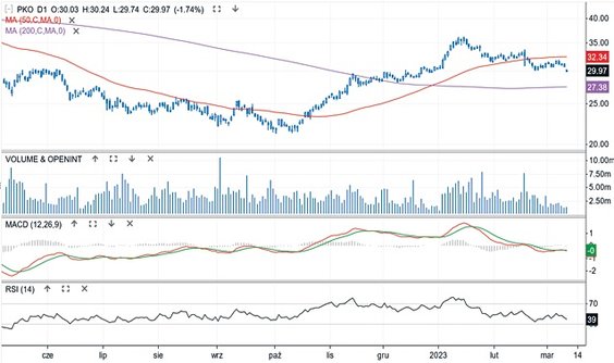 Problemy zagranicznych gigantów bankowych – Credit Suisse i Silicon Valley Bank – odbiły się rykoszetem na rodzimym sektorze. WIG-banki nie zdołał pokonać średniej z 50 sesji, a piątek zaczął dużą luką spadkową i zbliżył się do dołka korekty. Jego lider – PKO BP – ten dołek już pogłębił, spadając do 29,74 zł. Jeśli presja podaży będzie się utrzymywać, cena może zejść do 200-sesyjnej średniej, która przebiega teraz przy 27,4 zł. A przypomnijmy, że oprócz zagranicznych czynników ryzyka sektor zmaga się też z lokalnymi (orzeczenie TSUE, wakacje kredytowe).