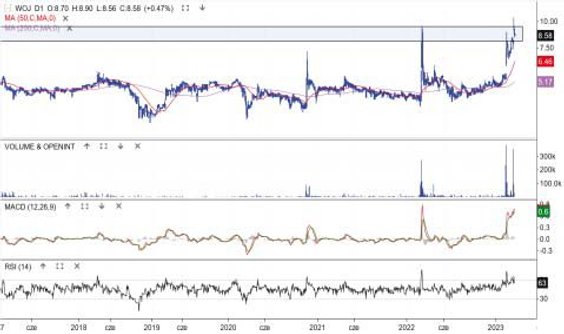 Producent obuwia poinformował w minionym tygodniu o wartym 138,6 mln zł kontrakcie z polskim wojskiem. Informacja spowodowała silny skok notowań przy wysokich obrotach. We wtorek cena sięgnęła 10,4 zł, czyli była najwyżej w historii. I choć kontrakt wydaje się potencjalnym game changerem, to warto zerknąć na wykres z szerokiej perspektywy. Okolica 9–10 zł to silny długoterminowy opór. To tu zatrzymała się zwyżka wywołana inwazją Rosji na Ukrainę. Biorąc pod uwagę skalę ostatnich zwyżek i fazę wykupienia, rośnie ryzyko silniejszego spadku. Celem może być domknięcie wtorkowej luki i test średniej z 50 sesji.