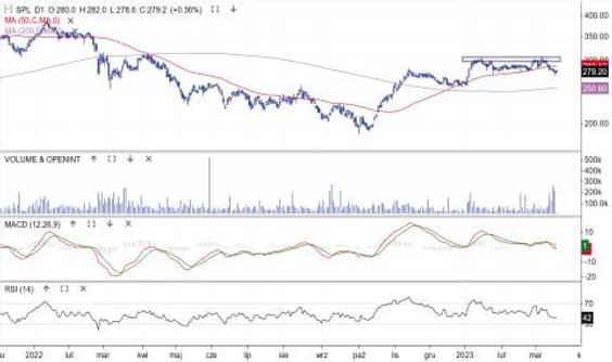 Cena akcji biotechnologicznej spółki weszła w drugiej połowie ubiegłego roku w fazę konsolidacji. W jej ramach kurs oscylował głównie między pułapami 25 i 20 zł. W minionym tygodniu cena wybiła się dołem z tego układu i dotarła w porywach do 18,22 zł. Mamy więc negatywny sygnał, sugerujący powrót na długoterminową ścieżkę spadków, w co wpisuje się układ średnich z 50 i 200 sesji. Celem minimum w krótkim terminie jest 15 zł, co wynika z szerokości konsolidacji. Po drodze wsparciem może być lokalne minimum z kwietnia 2020 r., czyli 17 zł.