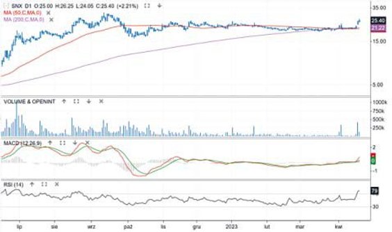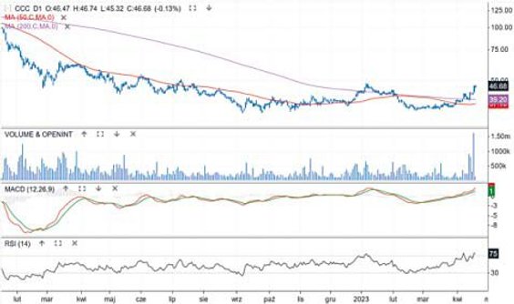 Na wykres obuwniczej spółki warto zerknąć z szerokiej perspektywy. Cena próbuje zmienić kierunek głównego trendu na wzrostowy. W strefie 33–34 zł udało się „uklepać” potencjalne dno. Notowania przebiły już średnie z 50 i 200 sesji, a w minionym tygodniu, przy wyraźnie podwyższonym obrocie, doszły do poziomu 46,74 zł. Na wykresie widać zaokrąglone dno i wstępne sygnały przesilenia. Spółce pomagały ostatnio informacje, że w procesie ABB popyt kilkukrotnie przewyższał podaż. Najbliższym oporem jest styczniowy szczyt 48,28 zł. Wspomniane średnie wyznaczają obszar wsparcia.