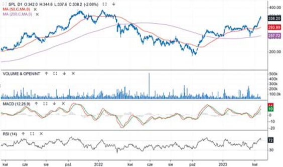 Polski sektor bankowy otrząsnął się już po marcowym kryzysie. Widać to po zachowaniu WIG-banki, który powoli zbliża się do styczniowego szczytu, a także na wykresach poszczególnych przedstawicieli sektora. Widać to dobrze w przypadku Santandera. Kurs jego akcji przełamał silny opór 300 zł, wyznaczony przez lokalne maksima ze stycznia i marca. W minionym tygodniu cena dotarła prawie do 350 zł. Oscylatory MACD i RSI wskazują już wykupienie, więc należy liczyć się z ryzykiem korekty. W szerszym ujęciu kurs powinien jednak zmierzać do długoterminowego oporu 390 zł.