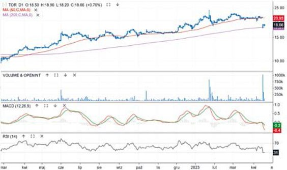 Od grudnia 2022 r. cena akcji operatora kolejowych przewozów towarowych nie może przebić się przez strefę oporów 16,5–17,5 zł. W minionym tygodniu kurs wyraźnie zawrócił w dół w tych rejonach, a następnie przełamał średnią z 50 sesji. Wygląda na to, że rynek wszedł w kolejne, cykliczne schłodzenie. Dwa poprzednie sprowadzały notowania w rejon 14,6 zł lub nawet 14 zł. Pułapy te wyznaczają potencjalny zasięg obecnej fali zniżek. A jeśli cena przebije się niżej, będzie to negatywny sygnał, bowiem do 14 zł zbliża się umowna granica bessy, czyli średnia z 200 sesji.