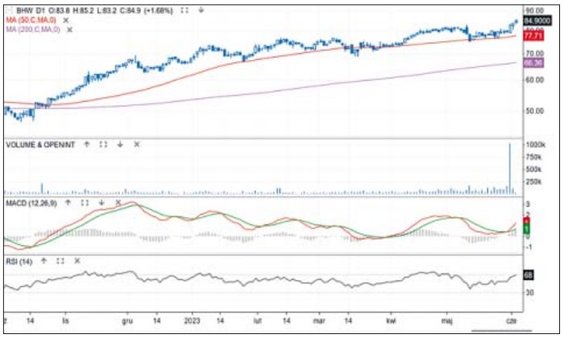 Właściciel sieci sklepów poinformował, że rozpoczyna budowę centrum dystrybucyjnego w Wielkopolsce. Wartość inwestycji to 130 mln zł i będzie finansowana ze środków własnych. Informacja sprzyjała kontynuacji trendu. Po trzech spadkowych sesjach z rzędu w czwartek cena zawróciła w górę nad średnią z 50 sesji i długą białą świecą przebiła poprzedni szczyt trendu, a w piątek przed południem ustanowiła nowy rekord 455,8 zł. Oscylatory RSI i MACD mają jeszcze przestrzeń do zwyżek, co sugeruje, że możemy zobaczyć niebawem kolejne szczyty. Średnia pozostaje wsparciem (obecnie 407 zł).