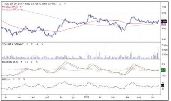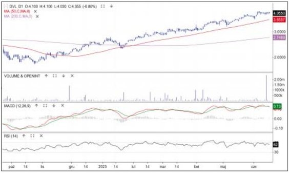 Od października 2022 r. kurs dewelopera porusza się w stabilnym trendzie wzrostowym. Na początku czerwca cena ustanowiła rekord wszech czasów 4,175 zł, a w minionym tygodniu weszła w fazę płaskiej korekty. W ostatnich dniach pojawiła się informacja, że spółka otrzymała pozwolenie na użytkowanie I etapu inwestycji Aleje Praskie na warszawskim Grochowie (121 lokali). Choć kurs nie zareagował, to pojawił się wyraźnie podwyższony słupek wolumenu. Biorąc pod uwagę kierunek głównego trendu, można zakładać, że czeka nas wyjście na szczyty. Średnia z 50 sesji jest najbliższym wsparciem.