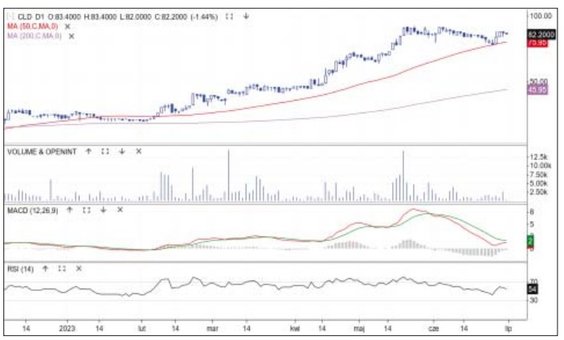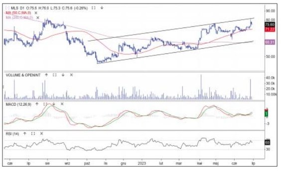 W minionym tygodniu kurs akcji technologicznej spółki niemal w punkt odbił się od ruchomego wsparcia – średniej z 50 sesji. Odbicie nastąpiło przy cenie 74 zł, a w piątek kurs oscylował przy 82 zł. Kurs akcji próbuje zakończyć korektę spadkową. Cykliczny zwrot widać także na oscylatorach MACD i RSI. Poza tym notowaniom pomagała informacja, że szacunkowa miesięczna dynamika sprzedaży danych do kluczowych klientów za kwiecień wyniosła +52 proc. r./r. Potencjalny cel zwyżki to przebicie szczytu hossy przy 90 zł. Wspomniana średnia pozostaje wsparciem.