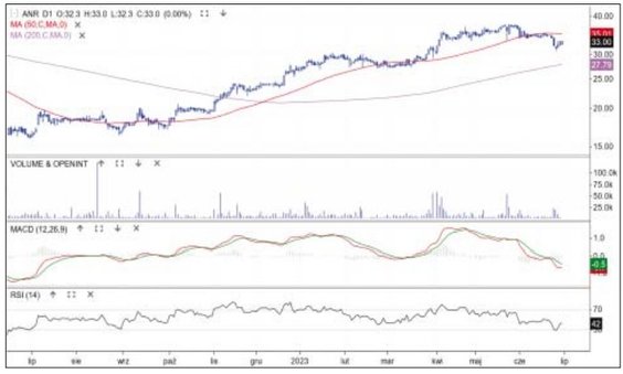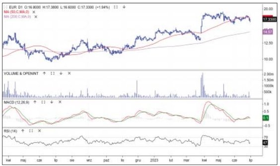 W I połowie czerwca kurs akcji właściciela cyfrowej platformy sprzedaży odzieży poruszał się horyzontalnie wzdłuż 50-sesyjnej średniej. Nie udało się jednak odbić od wsparcia. Cena ruszyła w dół, a w ubiegły poniedziałek spadek wyraźnie nabrał impetu. Czarnej świecy towarzyszył wysoki słupek wolumenu i cena zeszła do poprzedniego szczytu trendu przy 31 zł. Oscylatory MACD i RSI są już wyprzedane, co zwiększa szanse na zwrot, ale jeśli cena zejdzie poniżej 30 zł, to może ją czekać test średniej z 200 sesji, czyli umownej granicy bessy, która jest obecnie przy 27,8 zł.
