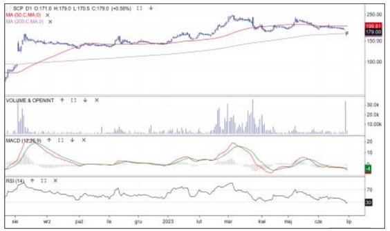 Od kwietnia cena akcji hurtownika konsoliduje się w strefie 19–17 zł, a w ostatnich dniach ruch horyzontalny zawęził się do średniej z 50 sesji. W czwartek cena spadła o ponad 5 proc. przy podwyższonych obrotach i ruszyła w kierunku 17 zł. Podaż mobilizowała informacja, że analityk Citi Rafał Wiatr obniżył rekomendację dla spółki z „neutralnie” do „sprzedaj”, a cenę docelową ustalił na 15,1 zł, czyli wyraźnie poniżej rynkowej. Jeśli ziści się scenariusz eksperta, to kurs może zejść do linii średniej z 200 sesji (obecnie 14,6 zł), a więc czekać nas może test granicy bessy.