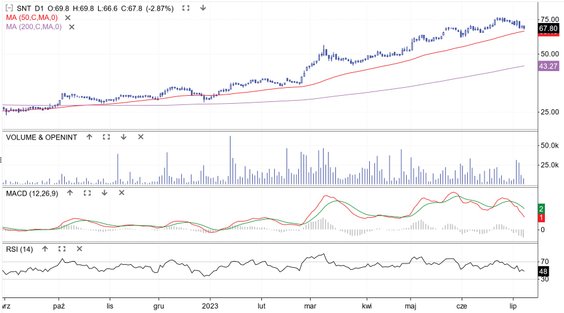 Kurs akcji spółki zajmującej się diagnostyką obrazową porusza się w trendzie wzrostowym, ale w II połowie czerwca cena weszła w fazę schłodzenia. W minionym tygodniu spadała do 66,6 zł, gdzie kumulują się dwa ważne wsparcia – poprzedni szczyt trendu oraz średnia z 50 sesji. Przy schłodzonych już oscylatorach MACD i RSI daje to szanse na zakończenie korekty. Zwłaszcza że ze spółki napłynęły ostatnio dobre informacje – zakończony proces konsultacji projektu kardioznacznika z amerykańską Agencją Żywności i Leków oraz podpisanie umowy z konsorcjum polskich szpitali o wartości 8,97 mln zł.