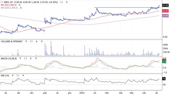 Od lutego na wykresie tworzy się szeroka formacja spodka z platformą. Ta ostatnia budowana była od drugiej połowy czerwca i w minionym tygodniu doszło do wybicia górą z tego układu. Formacja została więc aktywowana, co daje szanse na kontynuację trendu wzrostowego, który zaczął się 13 miesięcy temu. Najbliższe opory techniczne zlokalizowane są przy 35 zł, a wsparciem jest szczyt formacji przy 25 zł. Spółce pomagała ostatnio publikacja na łamach „Heart Rhythm O2”, gdzie opisano stworzony przez nią system do wykrywania częstoskurczu komorowego, który bazuje na sztucznej inteligencji.