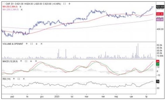 Dystrybutor części samochodowych ma za sobą znakomitą serię zwyżek. Od 26 czerwca do 12 lipca Inter Cars zanotował 13 sesji bez spadku notowań. Dzięki temu cena akcji wyszła z korekty spadkowej i wróciła na ścieżkę hossy, wyznaczając w minionym tygodniu jej nowe maksimum, 624 zł. Warto dodać, że na dnie wspomnianej korekty pojawił się wyraźnie podwyższony wolumen, co sugeruje duży napływ kapitału. Zwyżkom sprzyjają też czynniki fundamentalne – w czerwcu jej sprzedaż wzrosła o 18,3 proc. r./r., do 1,04 mld zł. Oscylatory są jednak wysoko, co w krótkim terminie grozi korektą. Najbliższe wsparcie to 600 zł.