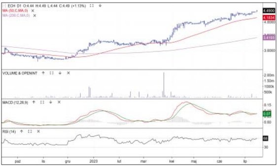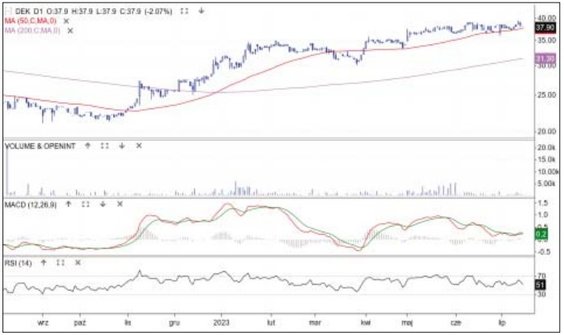 Budowlana spółka porusza się w rytm trwającej na GPW hossy, regularnie broni średniej kroczącej z 50 sesji i po korektach wyznacza nowe maksima. W czerwcu Dekpol wszedł w fazę schłodzenia, ale w ub. tygodniu cena wybroniła wspomnianą średnią i wyszła na nowy szczyt 39,4 zł. Zwyżce towarzyszył wyższy obrót, a na oscylatorze MACD pojawił się sygnał kupna tuż nad linią 0. Jeśli to nowa fala hossy, to jej celem jest długoterminowe maksimum 42 zł. Bykom sprzyja informacja, że spółka ma list intencyjny ws. budowy zakładu produkcyjnego, a wartość umowy to 7 proc. ubiegłorocznych przychodów.