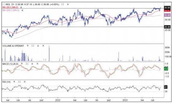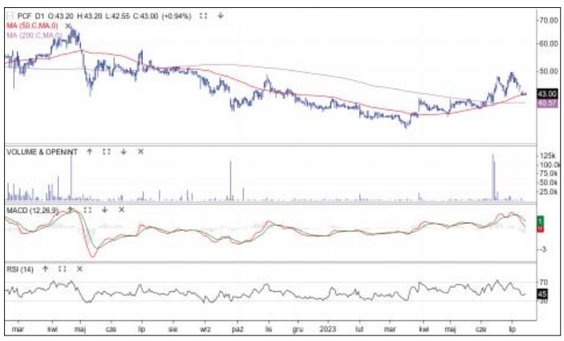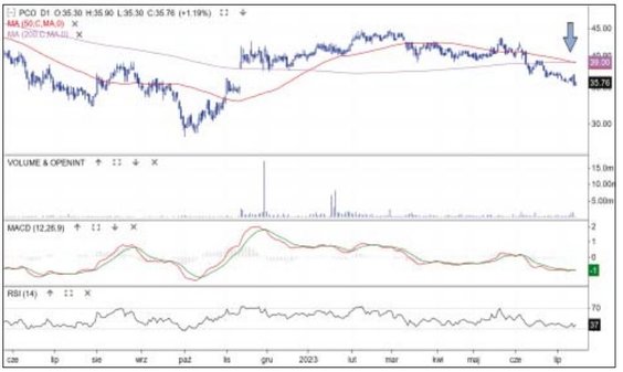 Kurs akcji węgierskiej spółki od ponad roku porusza się w szerokiej konsolidacji, w ramach której większość fal zwyżek i zniżek zamyka się w przedziale 27–36,5 zł. Co ciekawe, dotychczasowym testom górnej granicy towarzyszyły wyraźnie podwyższone obroty, po czym następował cykliczny zwrot w dół. Jest to o tyle istotne, że w minionym tygodniu doszło do kolejnego naruszenia owej granicy i ponownie słupki wolumenu wyraźnie wzrosły. Zakładając kontynuację cykliczności, należy liczyć się z ryzykiem ataku podaży i zejściem kursu na niższe poziomy. Najbliższe wsparcie to 35,5 zł.