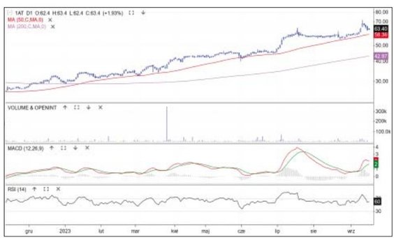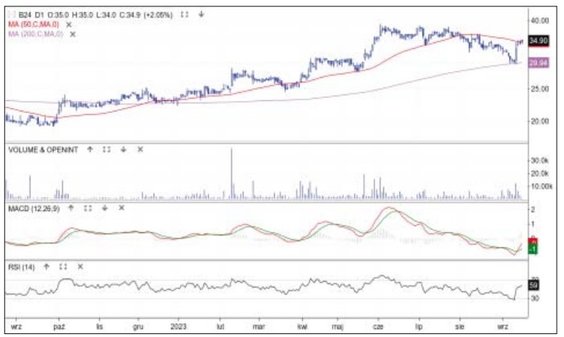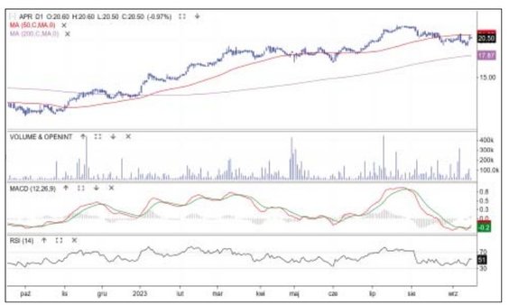Dystrybutor części samochodowych pokazał wyniki za II kwartał. Zarobił na czysto 64,15 mln zł, czyli o 22 proc. więcej niż w analogicznym okresie 2022 r. W reakcji na raport cena akcji wzrosła o 3,9 proc., naruszając średnią z 50 sesji. Atak na opór zwiększa techniczne szanse na wydostanie się z korekty trendu, w której notowania tkwią od sierpnia. Na korzyść byków działa sygnał kupna, który pojawił się na oscylatorze MACD w strefie wyprzedania. Średnia z 50 sesji pozostaje krótkoterminowym oporem, a jej wolniejsza wersja (200-sesyjna) jest w tej chwili kluczowym wsparciem (przy 17,9 zł).
