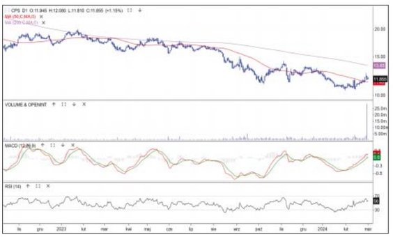 Kurs akcji wykazywał w minionym tygodniu podwyższoną zmienność i obroty, co ma związek z opuszczeniem tej spółki indeksu MSCI Global Standard. Nie brakuje tych, którzy liczą na to, że wraz z tym rebalancingiem skończy się „shortowanie” spółki i przynajmniej w krótkim terminie pojawi się na niej większy popyt. Wyjście notowań powyżej średniej z 50 sesji, do którego doszło w ostatnich dniach, wpisuje się w tę tezę od strony technicznej. Teraz kluczowy opór to 13,5 zł, gdzie nakładają się ostatnie lokalne szczyty i średnia 200-sesyjna. Wsparciem pozostaje strefa między szybszą średnią i dołkiem bessy.