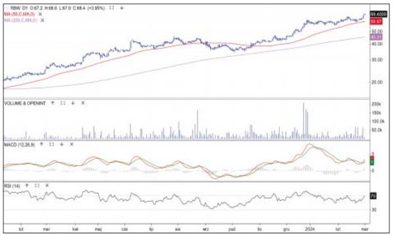 Od 8 lutego notowania akcji medialnej grupy poruszają się między szczytem hossy a średnią z 50 sesji. Trwa płaska korekta, dzięki której oscylatory MACD i RSI zdążyły się już lekko wychłodzić. Trend główny jest wzrostowy, a w jego trakcie tylko dwa razy korekta naruszała silniej średnią z 50 sesji. Jeśli tym razem skończy się łagodnie, można liczyć w krótkim terminie na ruch do nowych szczytów. Byki wspierają ostatnie komunikaty o walce Agory o odszkodowania od Google Netheralnds o wartości ponad 44 mln euro. Najbliższym oporem jest szczyt 12,75 zł, a wsparciem wspomniana średnia (11,6 zł).