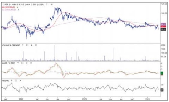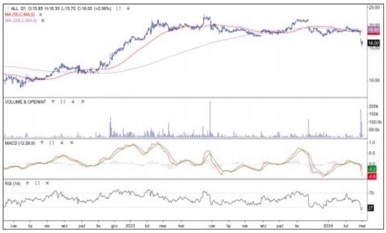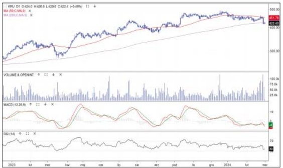 Od połowy grudnia kurs akcji spółki zajmującej się zarządzaniem wierzytelnościami jest w korekcie. Zniżka zaczęła się z 492,2 zł, a w minionym tygodniu sięgnęła 418,2 zł (-15 proc.). Notowania naruszyły średnią z 200 sesji, umowną granicę hossy. Taka sytuacja nie zdarza się często. Jeśli szukać analogii historycznej, to przełamanie tej średniej w lutym 2022 r. przyniosło pogłębienie zniżki i kurs utknął w konsolidacji na ponad rok. Zachowanie kursu przy średniej będzie bardzo istotne. Byki wspiera fakt, że wyniki finansowe były zgodne z oczekiwaniami, a obligacje spółki wciąż cieszą się dużym popytem.