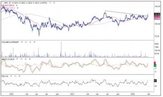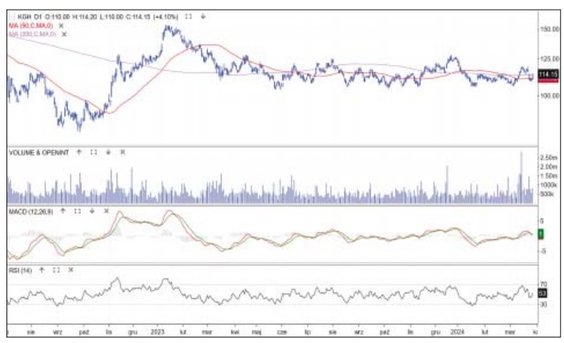 W minionym tygodniu kurs akcji miedziowego giganta zszedł poniżej 109 zł, czyli znalazł się w dolnej części trwającej już rok konsolidacji. Powodem zniżki była informacja, że spółka dokonała odpisów aktualizujących wartość aktywów krajowych i zagranicznych na prawie 4 mld zł. W czwartek cena jednak wyraźnie zawróciła, wracając powyżej średnich z 50 i 200 sesji. Notowania wspierała drożejąca miedź. Jeśli odpisy są już w cenach, a cena surowca będzie rosnąć, kurs akcji może ruszyć do górnej strefy konsolidacji, czyli 120–125 zł. Kluczowym wsparciem pozostaje 105 zł.