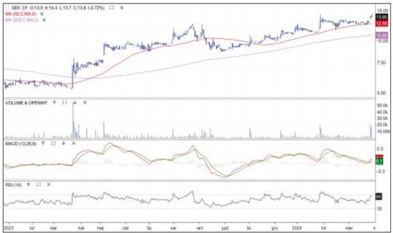 Kurs akcji przedstawiciela branży przetwórstwa rybnego porusza się w trendzie wzrostowym od roku. W minionym tygodniu cena odbiła się od średniej z 50 sesji i przebiła poprzedni szczyt hossy o 10 gr. Korekta wygląda zatem na zakończoną i zakładając kontynuację głównego trendu, należy oczekiwać rekordów. Zwłaszcza że w ostatnich dniach analitycy DM BOŚ wydali rekomendacją dla Seko, podnosząc cenę docelową do 18,9 zł. W czwartek na zamknięciu walory kosztowały 13,8 zł. Potencjał wzrostu wynosi zatem 37 proc. Wsparciem pozostaje średnia z 50 sesji, która przebiega na poziomie 12,7 zł.