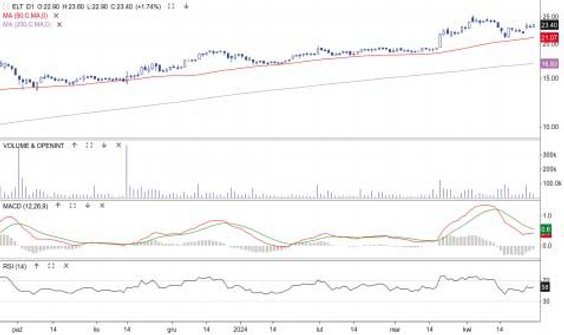 Od końca stycznia kurs akcji spożywczej spółki znajduje się w układzie korekty. Jej rozmiar jest niepokojący, tydzień temu notowania znalazły się bowiem o włos od średniej z 200 sesji, czyli umownej granicy hossy. Cena zawróciła, a w minionym tygodniu testowała już szybszą, 50-sesyjną średnią. Stronę popytową wspierały pozytywne wieści ze spółki. Emitent podał wyniki za 2023 r., w tym prawie 355 mln zł przychodów, podczas gdy w 2022 r. to było 329 mln zł. Ponadto spółka zamierza wypłacić rekordową dywidendę w wysokości 75 gr na akcję. Przebicie szybszej średniej może otworzyć drogę na szczyt. Wolniejsza średnia pozostaje wsparciem (obecnie 17,45 zł).
