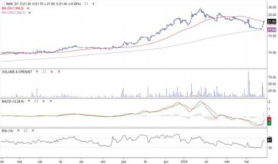 Kurs akcji wykonawcy instalacji elektrycznych porusza się w długoterminowym trendzie wzrostowym. Kwietniowa korekta zatrzymała się, podobnie jak poprzednie, w okolicy linii średniej z 50 sesji. Cena akcji powoli wychodzi z tego układu, a w minionym tygodniu byki wspierały czynniki fundamentalne. Spółka pokazała wyniki, w tym przychody, na poziomie 547 mln zł wobec 506 mln zł rok wcześniej. Ponadto zarząd zapowiedział rekordową dywidendę 2,5 zł na walor. Najbliższym oporem jest szczyt hossy, czyli poziom 25,35 zł. Wspomniana średnia pozostaje wsparciem. Obecnie przebiega ona na poziomie 21,1 zł.