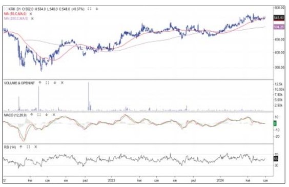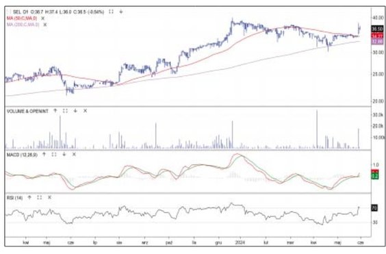 W minionym tygodniu producent chemii budowlanej pokazał solidne wyniki za I kwartał (19,1 mln zł zysku netto) i uchwalił najwyższą w historii dywidendę (1,5 zł na akcję). Inwestorzy zareagowali entuzjastycznie. Cena akcji przebiła średnią z 50 sesji i przełamała linię trendu spadkowego, trwającego od grudnia. Wybiciu towarzyszyły wyraźnie podwyższone obroty. Zachowanie notowań może zwiastować ruch w kierunku szczytu hossy w okolicy 40 zł, a jego przebicie będzie sygnałem kolejnej fali zwyżek w długoterminowym układzie wzrostowym. Strefa między średnimi z 50 i 200 sesji (33–34 zł) to najbliższe potencjalne wsparcie.