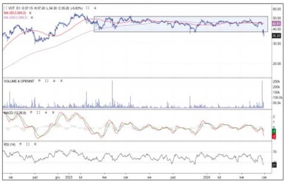 W minionym tygodniu kancelaria odszkodowawcza pokazała wyniki za I kwartał. Spółka zarobiła na czysto 20,5 mln zł, czyli o 45 proc. mniej niż rok temu. Rynek zareagował spadkiem notowań. W cztery sesje kurs spadł o blisko 20 proc., sięgając w piątek rano poziomu 34,3 zł. To oznacza, że kurs opuścił dołem długoterminową konsolidację, której dolna granica znajdowała się w strefie 37–40 zł. Szerokość konsolidacji oraz układ najbliższych wsparć sugerują potencjał spadku do 30 zł. Wspomniana strefa staje się teraz oporem i dopiero powrót do tych poziomów poprawi sytuację techniczną.