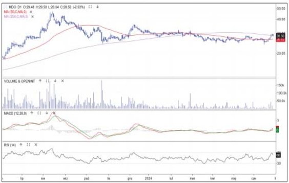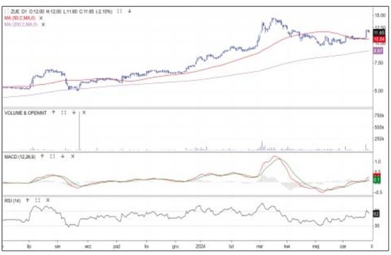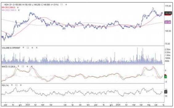 Cena akcji miedziowego giganta wróciła nad średnią z 50 sesji i po raz kolejny zaatakowała opór 150 zł. Notowaniom pomagał komunikat, że w maju spółka sprzedała prawie 62 tys. ton miedzi, czyli o 11 proc. więcej r./r. Warto zwrócić uwagę, że oscylatory MACD i RSI są na cyklicznie niskich poziomach, a ten pierwszy pokazał sygnał kupna. Spółce sprzyjają też dobre statystyki dla lipca. W ostatniej dekadzie KGHM zyskiwał w siedmiu na dziesięć przypadków, a średnia zmiana notowań wynosi +7,3 proc. Jeśli cena przebije 150 zł, kolejnym celem jest szczyt 170 zł. Wsparciem pozostaje wspomniana średnia i ostatni dołek 137 zł.