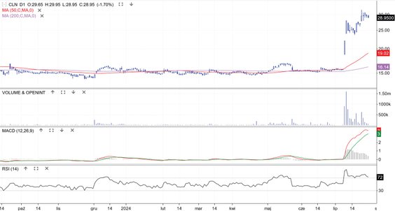 Branża biotechnologiczna imponowała w minionym tygodniu relatywną siłą. Jedną z gwiazd była spółka Celon Pharma. Kurs jej akcji rośnie już od 8 lipca, a więc od momentu ogłoszenia postępów w testach leku na schizofrenię. Ponadto w ostatnim tygodniu ceny docelowe dla spółki podnieśli Noble Securities (do 39,7 zł) i Trigon (do 45,7 zł). Trwająca fala zaczęła się z okolic 15,7 zł, a w ostatnich dniach kurs testował 30 zł. W krótkim terminie rynek jest wykupiony, ale w szerokim ujęciu czasowym ostatni ruch, poparty wolumenem i fundamentami, może być początkiem trwalszego trendu.
