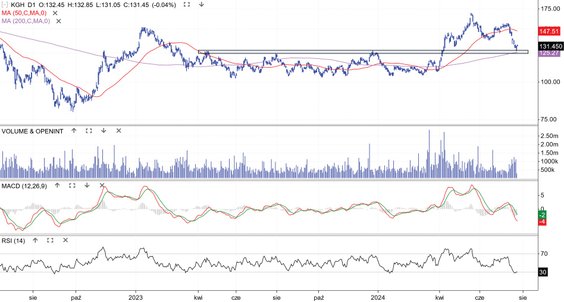 Dopiero w ostatnią środę miedziowy gigant przerwał serię siedmiu spadkowych sesji z rzędu. Poruszające się w ślad za miedzią notowania akcji KGHM dotarły do silnego wsparcia na poziomie 125 zł. To tu nakładają się na siebie lokalne szczyty ostatniej, średnioterminowej konsolidacji, a także linia średniej z 200 sesji. Test wsparcia zbiegł się w czasie z zejściem oscylatorów MACD i RSI do stref wyprzedania. Patrząc więc na KGHM czysto technicznie, perspektywa co najmniej krótkoterminowego odreagowania staje się całkiem realna. Najbliższe opory są w strefie 140–150 zł. Wsparciem pozostaje 125 zł.
