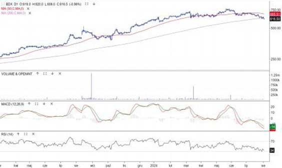 Notowania akcji banku spadały w piątek rano do 578 zł. To oznacza, że cena przebiła średnią z 200 sesji, a więc podobnie jak w Budimeksie, tak i tu mamy techniczne ostrzeżenie. Ta słabość jest o tyle niepokojąca, że dzień wcześniej mBank pokazał solidne wyniki. Zysk netto wyniósł 422 mln zł, czyli 23 proc. powyżej oczekiwań. Wygląda jednak na to, że w obecnej sytuacji górę biorą ogólne rynkowe nastroje, a nie kwestie fundamentalne. W trwające hossie była tylko jedna korekta, która naruszyła wspomnianą średnią. Mowa o marcu 2023 r. Wtedy rynek szybko wrócił na ścieżkę wzrostu.
